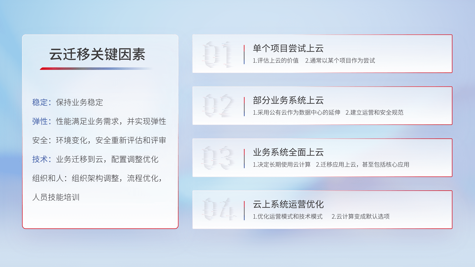 结合实际业务,,从规划设计、、、、云平台选型、、、云原生改造、、、数据迁移、、集成交付,,,,迁移全过程为客户识别最佳上云路径,,做好风险识别管理,,,设计网络架构、、、、身份权限、、、安全审计合规、、操作审计、、、日志审计、、、监控告警策略、、、多站点容灾设计等,,,,对云上基础设施进行整体规划,,,,提升IT治理水平,,,以满足弹性、、、高可用、、、高性能的需求。。。